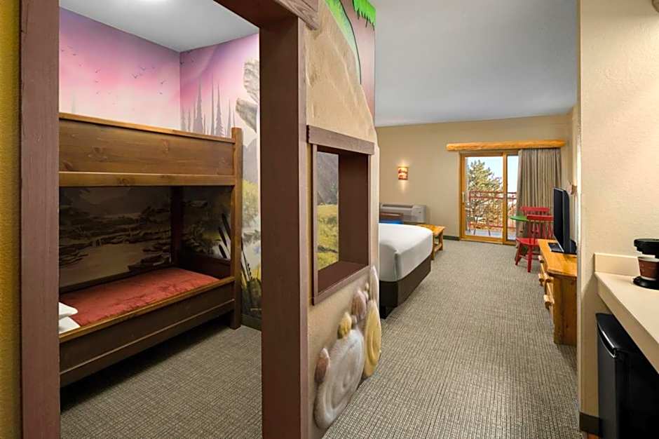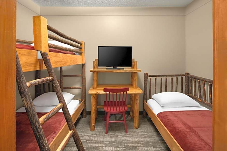 Great Wolf Lodge Sandusky offers various quadruple occupancy rooms, including Wolf Den Suites, Kid Cabin Suites, Family Fireplace Suites, and Family Suites. These rooms do not allow smoking and can accommodate 4 adults and 3 children. Bed options vary from twin beds to queen beds, along with sofa beds, and room sizes range from 452 sqft to 549 sqft, each featuring a balcony or patio.