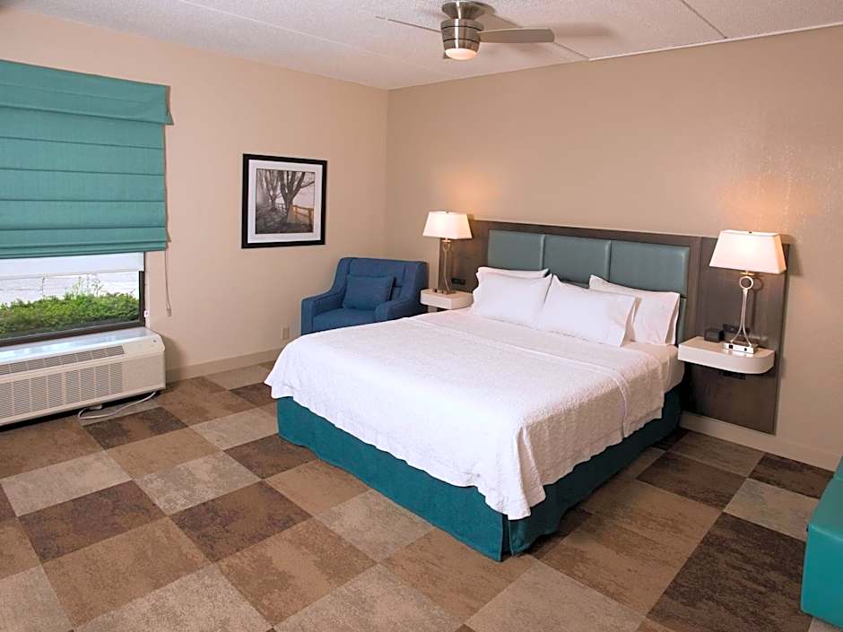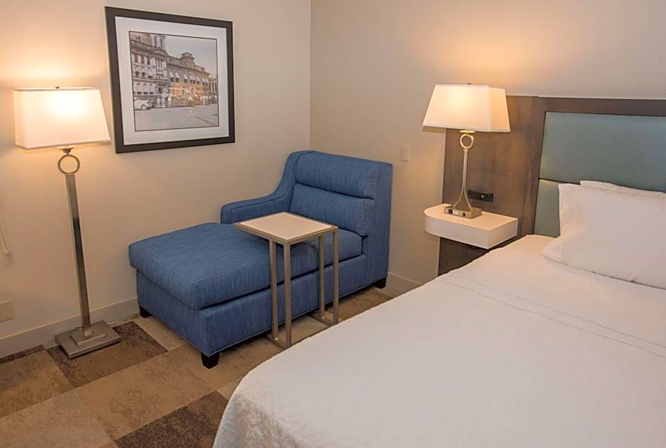 32-inch HDTV, free WiFi, oversized chair/ mini-bed, ottoman, work desk, coffeemaker Settle into this spacious non-smoking room which features one king-sized clean and fresh Hampton bed® and an oversized chair with ottoman which converts to a mini-bed. Relax and watch a movie on the 32-inch HDTV or work at the large desk and stay connected with free WiFi access. Enjoy the convenience of having a coffeemaker in your room. The bathroom provides fluffy towels and a shower with a Waterpik® showerhead and curved shower rod that allows more light and space in the shower.