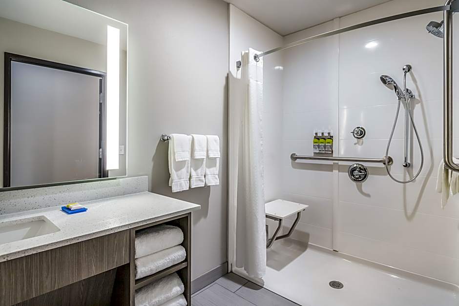 The Holiday Inn Express & Suites Tulsa East - Catoosa offers a variety of room types. These include King Rooms with either a mobility access roll-in shower or a mobility access tub, Queen Rooms with two queen beds, Twin Rooms with a mobility accessible tub, as well as Suites with two beds or a king size bed. All rooms are non-smoking and have a room size of 301 sqft. The occupancy ranges from 2 adults and 1 child to 6 adults and 4 children, depending on the room type.