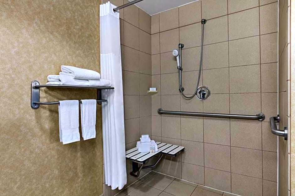Any corresponding photo may not reflect the specific accessible room type or room feature. This mobility and hearing accessible, one-room, nonsmoking studio suite features one king sized bed , and an accessible roll-in shower. The suite also has a visual alarm and notification devices for the doorbell or door knock and incoming phone calls. The room features include a microwave, refrigerator, wet bar, comfortable soft seating, a HDTV, and easy to operate alarm clock/radio. The free high speed internet access will help you stay connected while on the road. If you prefer not to work at the desk, you can use the convenient lapdesk instead. You'll also enjoy the convenience of having a coffee maker with tea service and iron/ironing board in your room.
