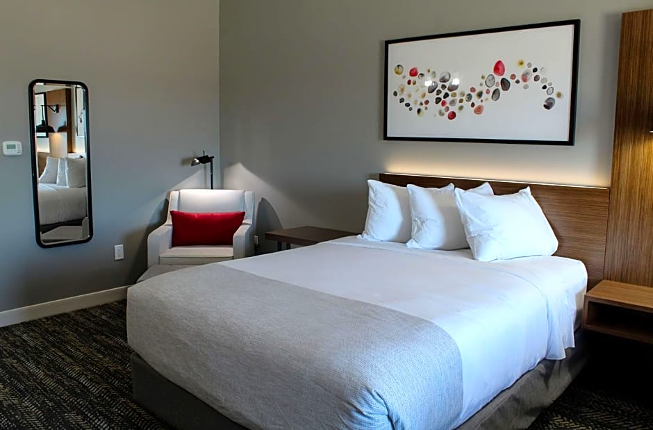 Indulge in luxury in our King Room with Jetted Tub - Non-Smoking. Unwind in the spacious hot tub, enjoy a private bathroom and kitchenette, and relax in the cozy sitting area. Perfect for a couple's getaway or a small family retreat.