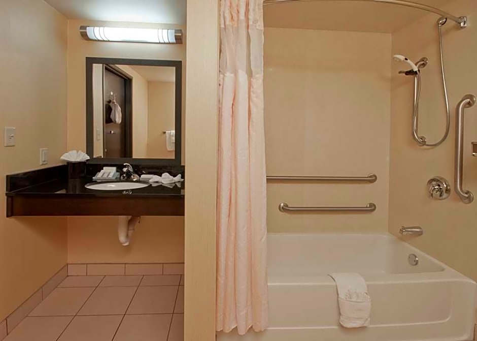 This mobility and hearing accessible standard room features two queen-sized beds, and an accessible tub. The room also has a visual alarm, and notification devices for the doorbell or door knock and incoming telephone calls. Grab bar in tub with attached accessible seating, lowered vanity in bathroom, and lowered closet shelf. The ergonomic Mirra chair by Herman Miller is good for your back and better for work. Enjoy your favorite television show on our 36-inch HDTV. There is also a microwave, refrigerator and coffee/tea maker to help you feel at home. And for conducting business, our rooms ensure your productivity thanks to the spacious work desk, two telephones with dataport and voicemail and complimentary WiFi access. Any corresponding photo may not reflect the specific accessible room type or room feature.