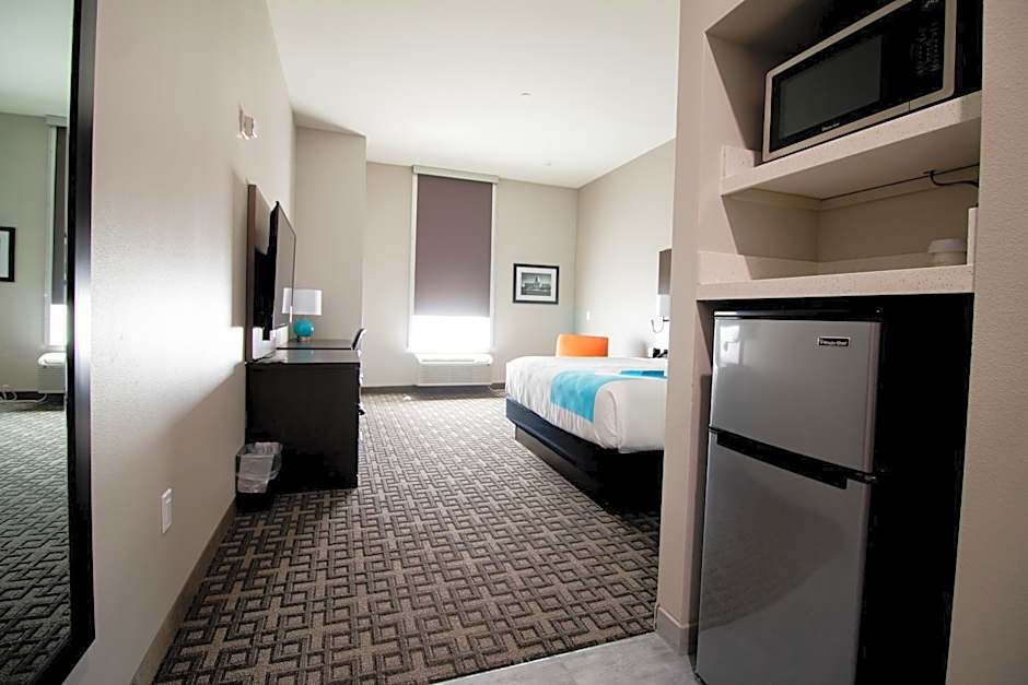The hotel seems like it recently got updated, so it has a fresh look. The room was large. The fridge was large. I loved the blinds! They were on a vertical track and diffused the light. Then blackout curtains over that.