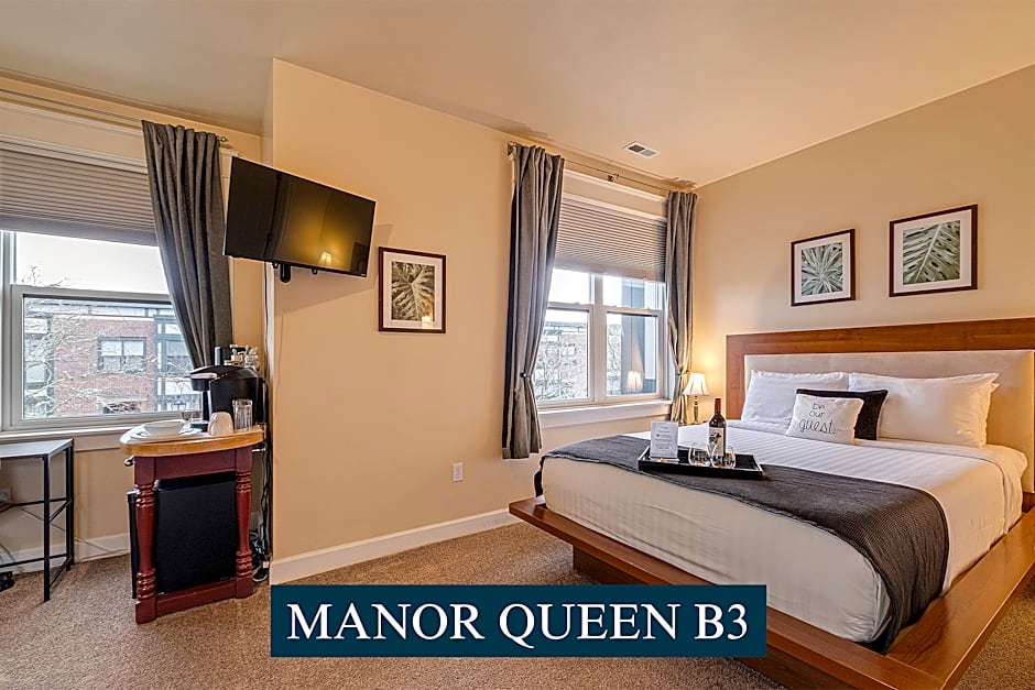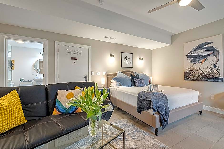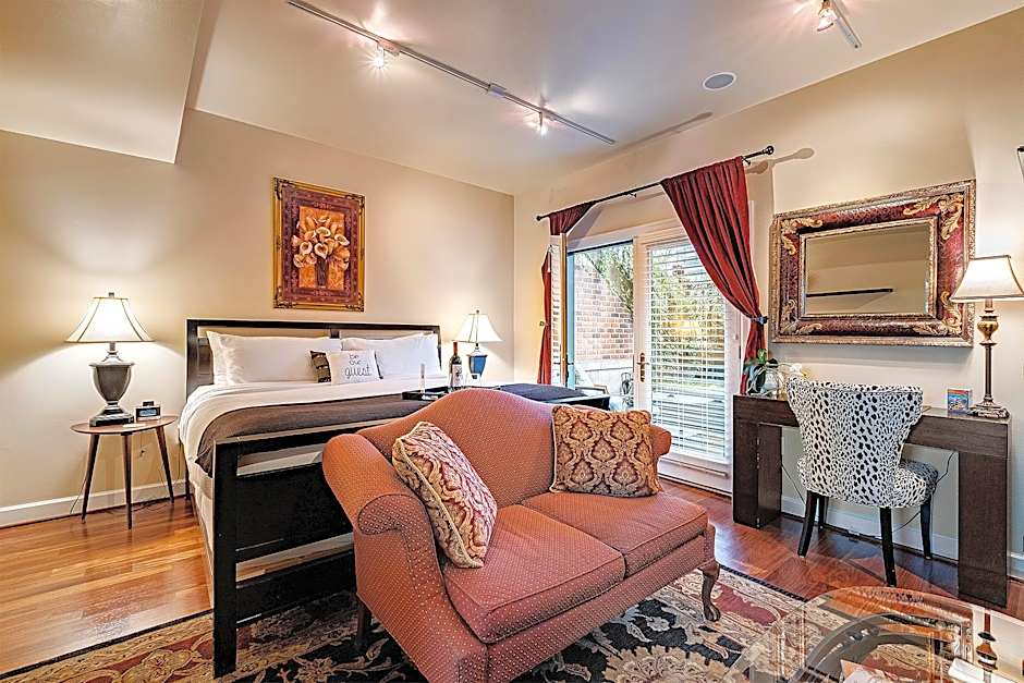 This room features a King Bed, small private courtyard with private street level entrance, Kitchenette with microwave, refrigerator, coffer service, and essential kitchen cutlery, plates, bowls, etc.