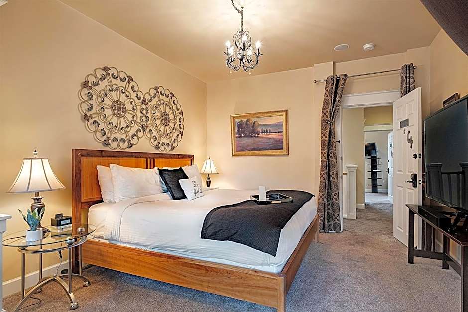 This room features a King bed, large flat screen TV, complimentary bottled water, complimentary breakfast voucher per day to the Tous Les Jors Bakery, comfortable sitting area, double-sink bathroom, which includes a standup shower and large soaking tub, and separate water closet.