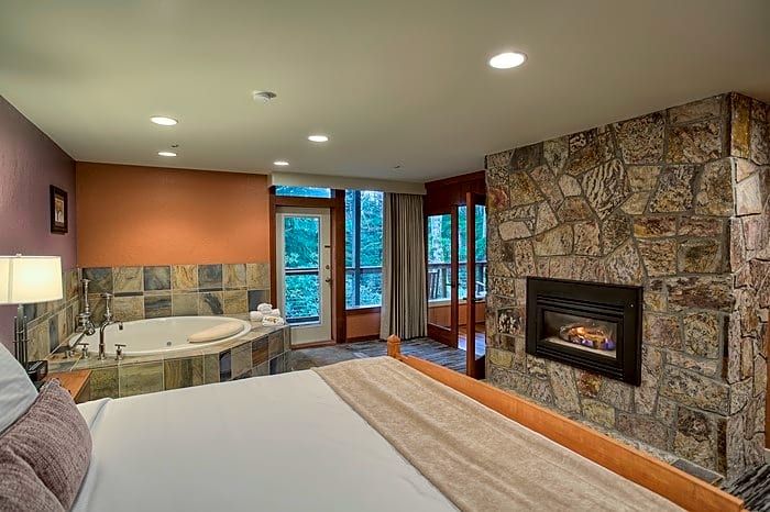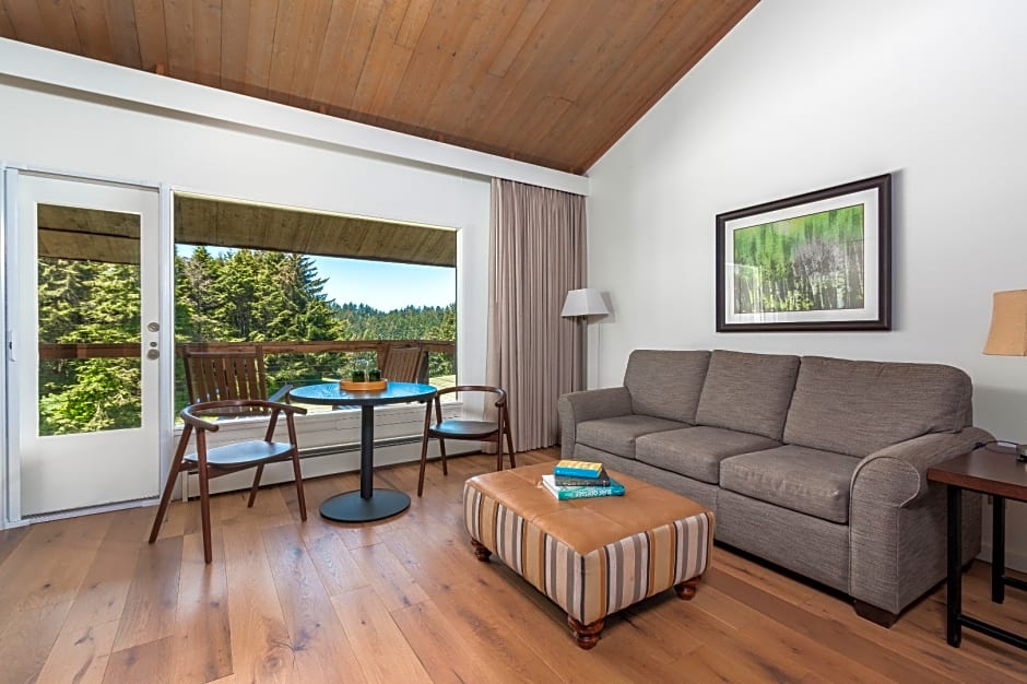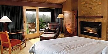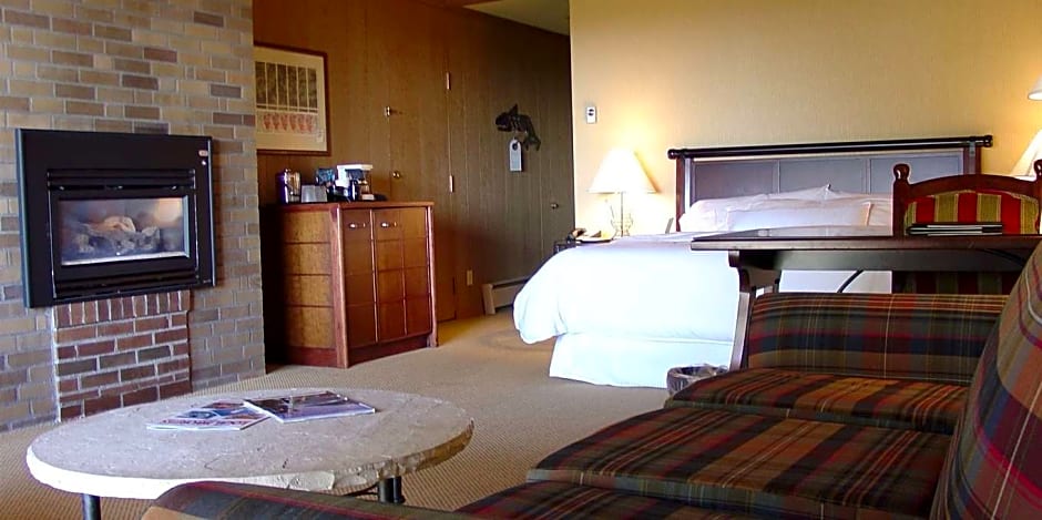 540 sq. ft. featuring a king bed, sitting area with a queen sofa pull-out, gas fireplace and private balcony overlooking the North Bay or Forest View. All rooms have microwaves and mini-fridges.