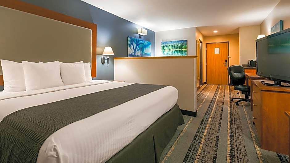 The Best Western Newberg Inn offers a variety of rooms including King Rooms with Bathtub - Disability Access and Soaker Tub, Queen Rooms with Two Queen Beds - Pet-friendly and without, and King Rooms with Roll-In Shower - Disability Access. The rooms have a maximum occupancy of 2 adults and 1 child, or 4 adults and 3 children. All rooms are non-smoking and have a room size of 301 sqft for the King Rooms and 355 sqft for the Queen Rooms. The beds in the rooms are either a King size bed or two Queen size beds.
