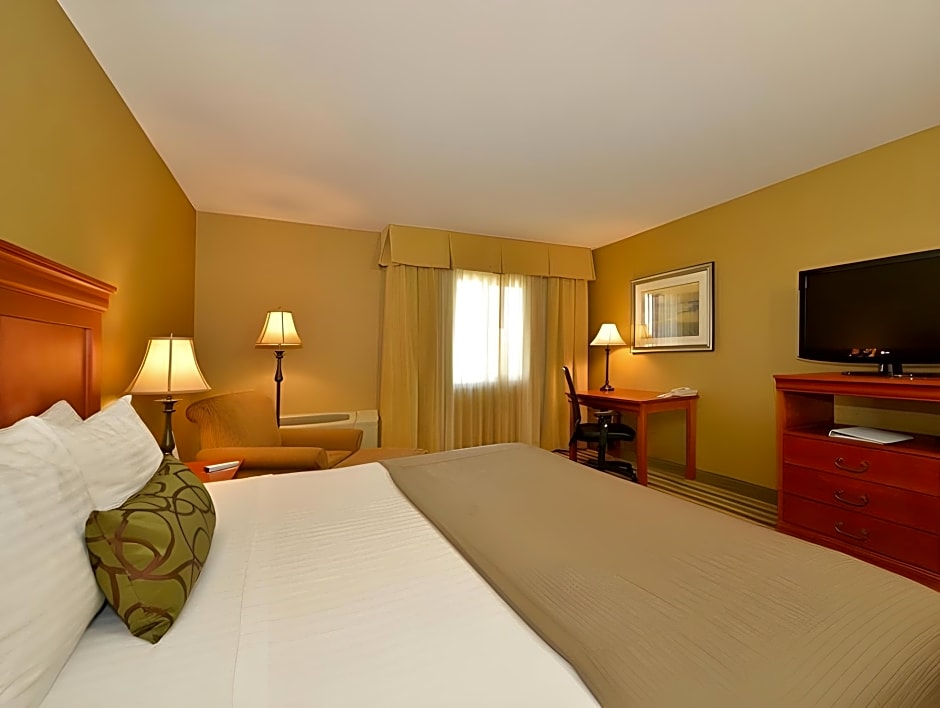 The Best Western Pendleton Inn offers a variety of rooms, including executive queen rooms with two queen beds, king rooms, executive king rooms, king rooms with roll-in showers (disability access), king suites with two king beds, and family suites. All rooms are non-smoking. The occupancy of the rooms ranges from 2 to 6 adults, depending on the room type. The beds in the rooms vary from 1 king size bed to 3 queen size beds. The room sizes range from 291 sqft to 463 sqft.