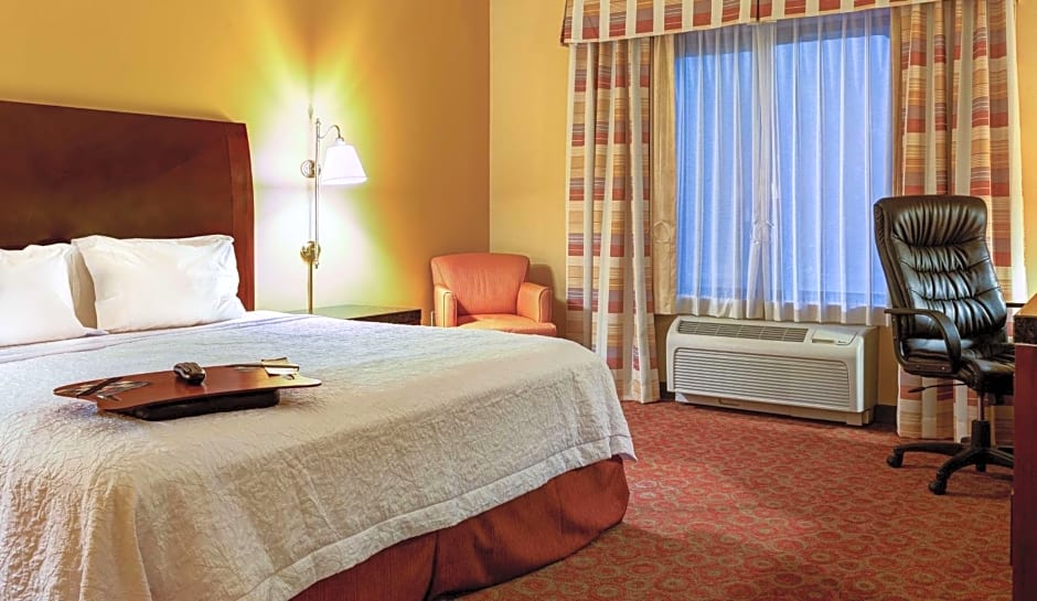 The types of rooms available at Hampton Inn Pendleton include King Rooms, Queen Rooms, and King Study Rooms. All rooms are non-smoking and can accommodate 2 adults and 1 child, except for the Queen Room which can accommodate 4 adults and 3 children. The King Study Rooms also have a sofa bed in addition to the king size bed. The King Room - Hearing Accessible and King Room Mobile/Hearing Accessible both have larger room sizes and offer accessibility features such as a tub.