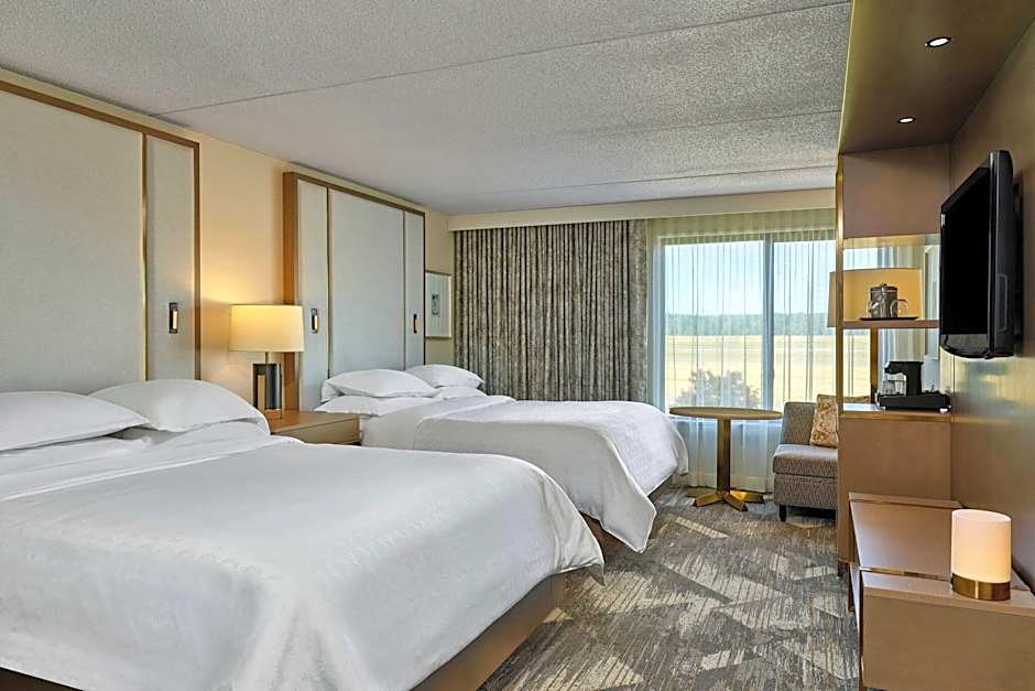 The Sheraton Portland Airport Hotel offers a variety of room types including guest rooms with 1 King or 2 Queen beds, as well as rooms with 2 Double beds and a sofa bed. There are also suites available with 1 King bed. All rooms are non-smoking and can accommodate between 3 and 4 adults, along with 2 to 3 children. Room sizes range from 258 to 721 square feet. Some rooms also have access to the Club lounge and are located on high floors.