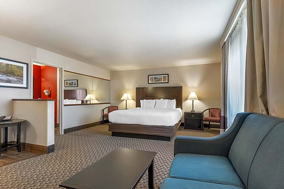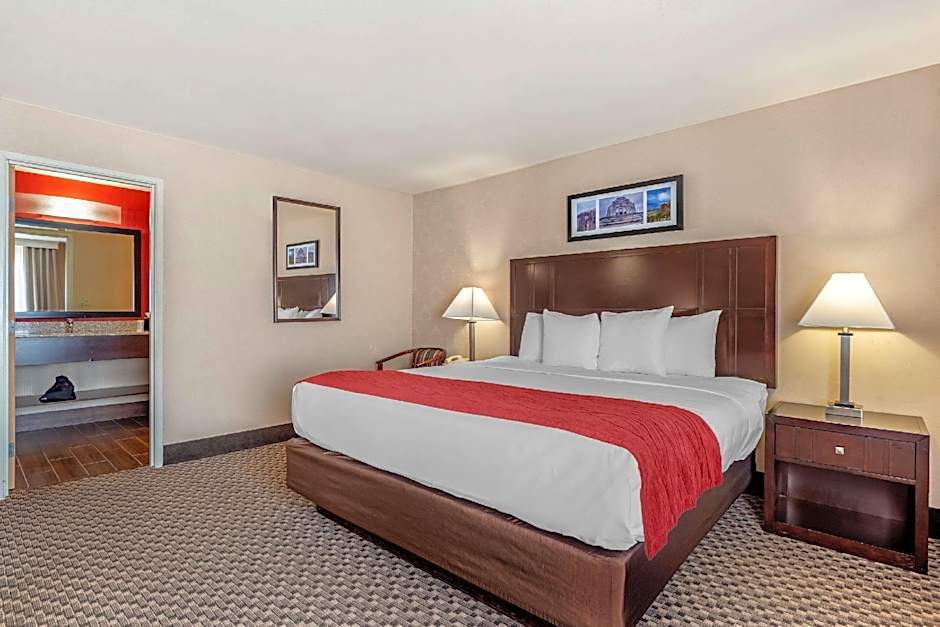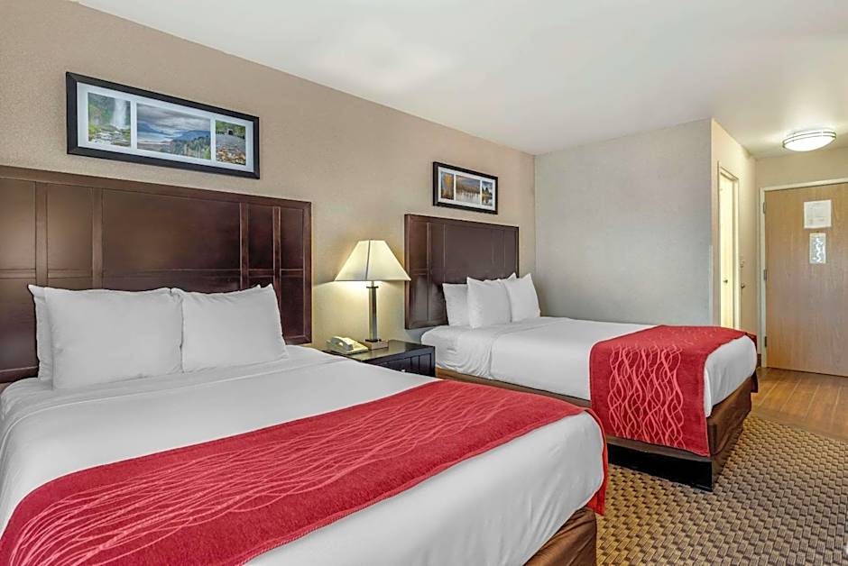 The Comfort Inn Troutdale-Portland East offers various room options including Queen rooms with two Queen beds, a Suite with one King bed and two Queen beds, and Double rooms with two Double beds. All rooms are non-smoking and have a room size of 205 sqft. The occupancy varies from 2 adults and 1 child up to 6 adults and 4 children, depending on the room type.