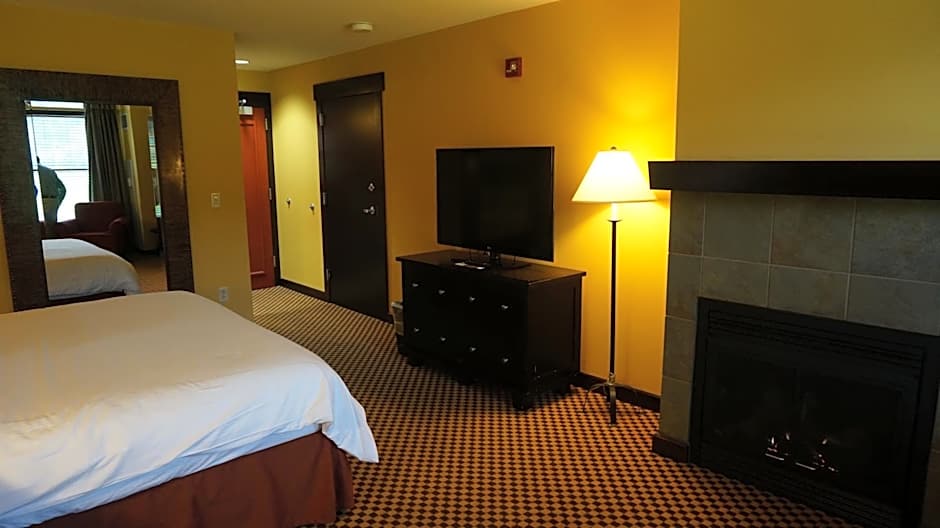 This room has a King bed, a sitting area with a fireplace, mini fridge, microwave, and a Keurig coffee maker.