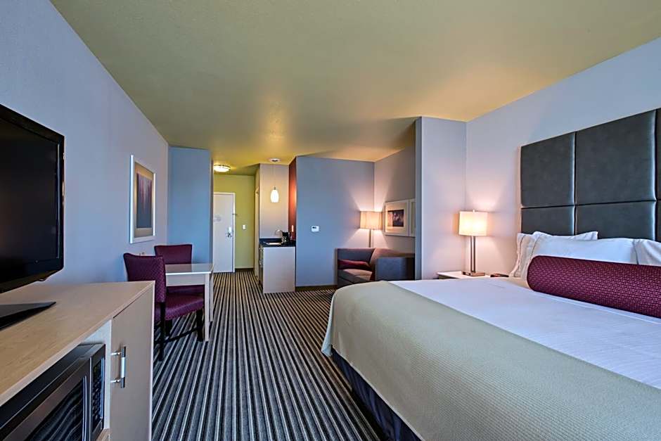 This suite features a king bed with living area and sofa bed, microwave and fridge