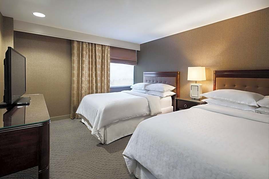 The Sheraton Pittsburgh Airport Hotel offers two types of rooms. The Standard King Room is a double room with a room size of 301 sqft and can accommodate 2 adults with a King size bed. The Double Room with Two Double Beds is also a double room with the same room size of 301 sqft, but instead of a King size bed, it has two Queen size beds and can also accommodate 2 adults. Neither of these room types allow smoking.