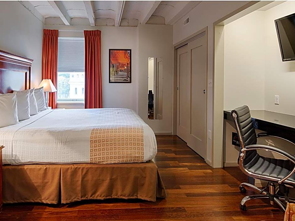 This non-smoking deluxe room features 1 king bed with whirlpool bath, rustic concrete loft style beamed ceiling and will accommodate up to 2 people. Plus high speed internet, coffee maker, hairdryer, iron and ironing board.