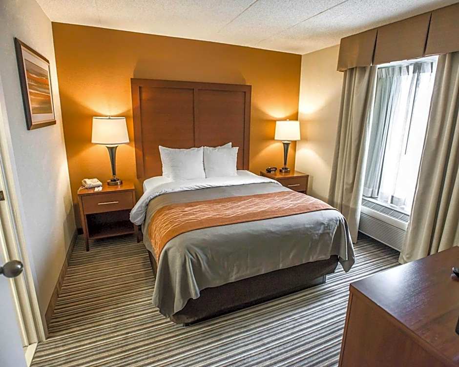 The Comfort Inn at the Park Hershey offers various types of rooms. These include Double Rooms, Standard Queen Rooms with Two Queen Beds, a Family Suite Queen, and Queen Rooms with Sofa Beds. The occupancy ranges from 2 adults and 1 child to 4 adults and 3 children. All rooms are non-smoking and have different bed sizes such as double, queen, and sofa beds. Room sizes vary between 205 sqft and 301 sqft.