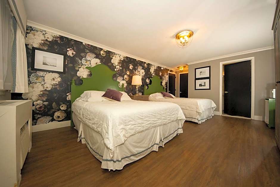 This room features 1 queen bed and 2 double beds, a small refrigerator and a microwave.