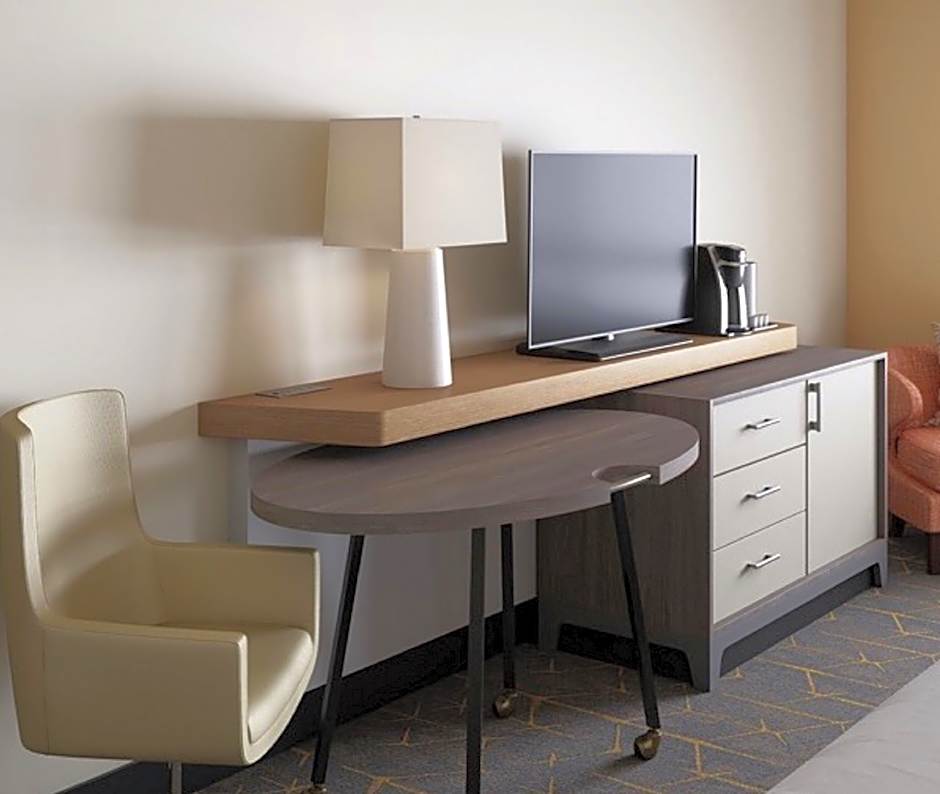 The spacious premium room features a king-sized bed plus a queen-sized sleeper sofa bed, a microwave, a refrigerator, and a Kuerig coffee maker. A large bathroom with a lit mirror offers Dove bathroom amenities provided in sustainable bulk containers. Stay connected with free Wi-Fi and multiple HDMI ports to stay charged. Work on our portable desk, unwind by watching your favorite show on a 50" smart TV, and get a great night's sleep with the use of the room-darkening shades.