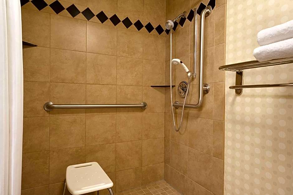 This mobility accessible standard room features two double-sized beds, and a roll-in shower. Relax in a warm and welcoming accessible guest room with a roll-in shower with attached accessible seating, lowered vanity in bathroom, and lowered shelf in closet. And the pursuit of the perfect night's stay continues with an evolution of innovative new amenities including the bed, chair, television and crisp white duvet. The ergonomic chair is good for your back and better for work. Enjoy an in-room movie or your favorite television show on our 36-inch HDTV. There's also a microwave, refrigerator and coffee/tea maker to help you feel at home. And for conducting business, our rooms ensure your productivity thanks to the spacious work desk, two telephones with dataport and voicemail and complimentary WiFi. Any corresponding photo may not reflect the specific accessible room type or room feature.