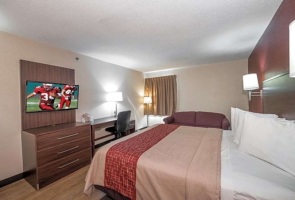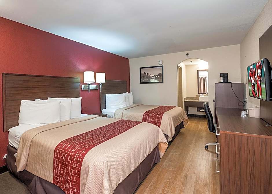 The Red Roof Inn Lancaster offers Double rooms with two Double beds or one King bed, accommodating up to 4 adults and 3 children or 2 adults and 1 child, respectively. All rooms are non-smoking and feature a room size of 280 sqft. Additionally, the hotel provides King Suites with a spa bath, suitable for 2 adults and 1 child, with a room size of 420 sqft.