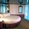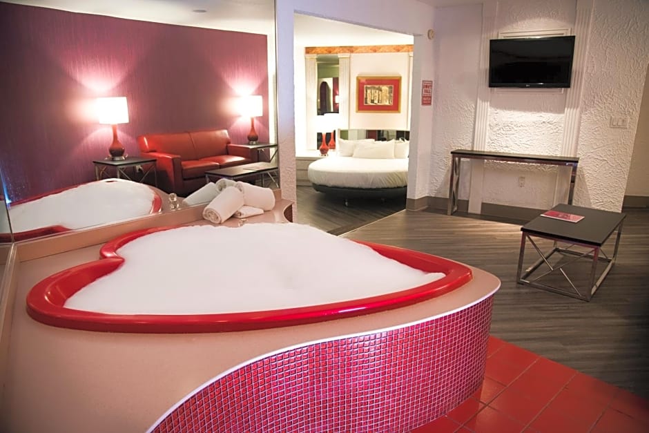 This suite includes a heart-shaped spa bath, private indoor heated pool, log burning fireplace and a round bed.