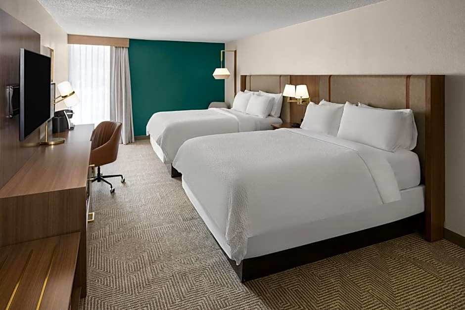 The hotel offers a variety of room types including Deluxe Twin Room, King Room, Standard Room, Queen Room with Two Queen Beds, Queen Room with Mobility Accessible Tub, Feature Queen Room with Two Queen Beds, Feature King Room, and Deluxe Queen Room with Two Queen Beds and Roll-In Shower. All rooms are non-smoking, have a room size of 323 sqft, and can accommodate 4 adults and 3 children. The bed sizes range from twin beds to queen beds.