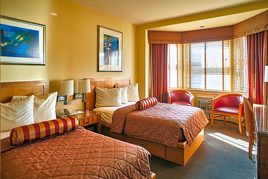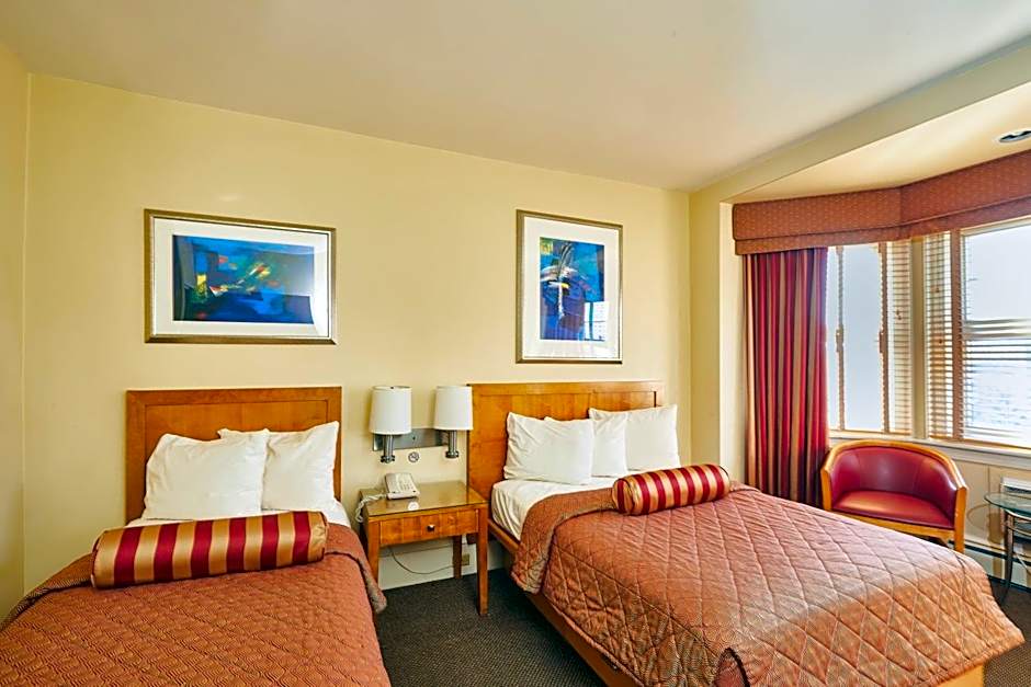 This room comes with two double beds, a mini refrigerator, bathroom with a standup shower and bay window with seating area.