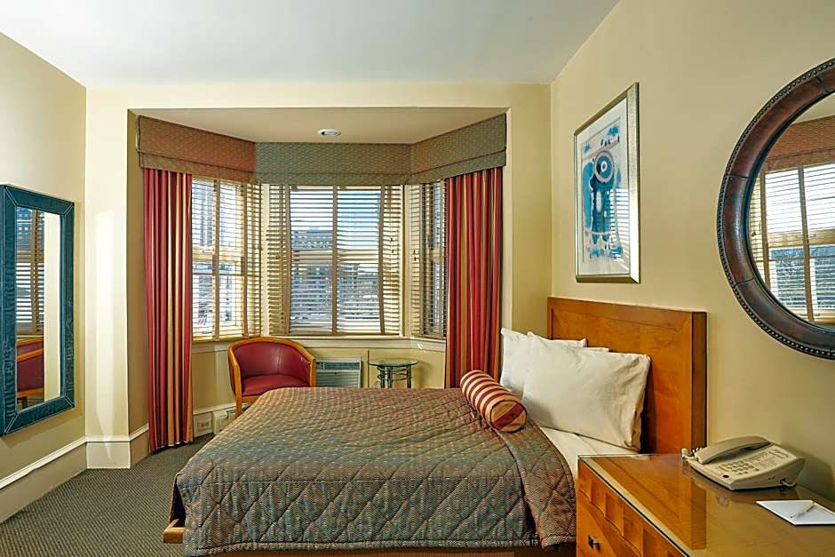 This room comes with a single bed, a bath with a standup shower and bay window with a seating area.