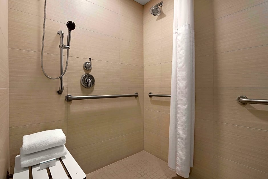 This mobility and hearing accessible, non-smoking one bedroom suite features one king-sized bed, and a roll-in shower. This suite also has a visual alarm and notification devices for the doorbell or door knock and incoming telephone calls, as well as a kitchen built to lower scale and fully equipped down to utensils, including a full-sized refrigerator, microwave, dishwasher and twin burner stove. The dining area can easily double as workspace. All of our suites keep you connected with complimentary internet access and telephone. Each guest room also has The Evolve AI 8-inch Color Touchscreen display replacing the alarm clock. It features: 5-Day weather display, alarm clock w/wake up scheduling, iPod/iPhone/iPad connectivity for audio and charging, internet radio, Pandora and ShoutCAST. Any corresponding photo may not reflect the specific accessible room type or room feature.