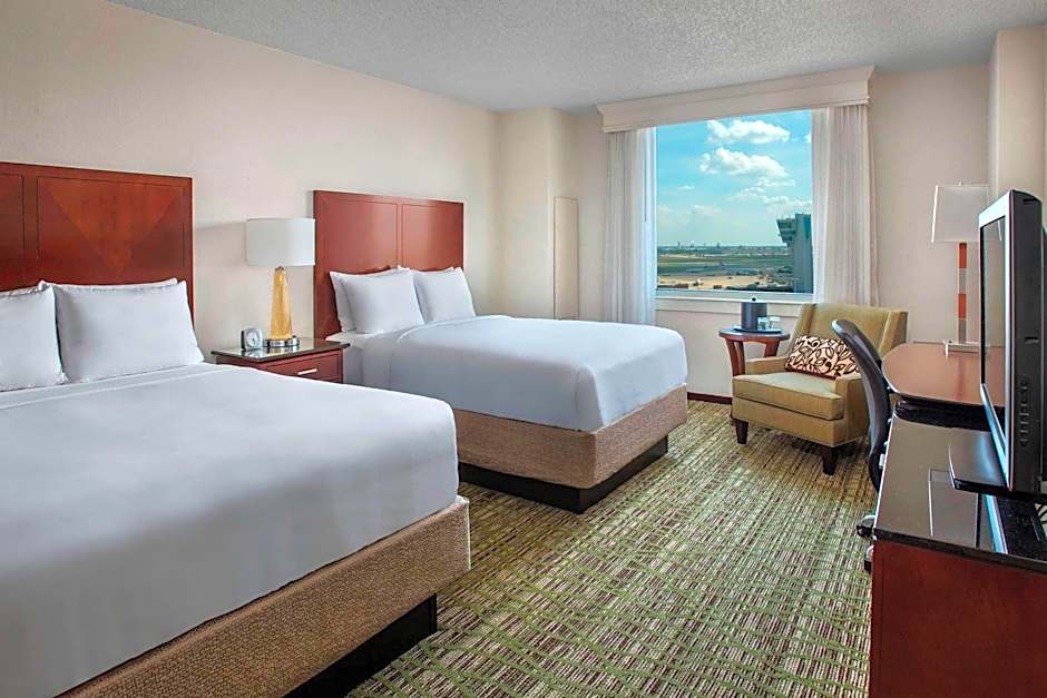 The front desk staff were exceptional: professional, welcoming, friendly. We hadn't planned to stay over, but flying standby and didn't make the last flight. Late night, needed to be back at the airport for a 6am. Having the convenience of a hotel with a direct walkway to a dedicated security entrance (no shuttles!) was well worth the extra $. There's even a kiosk in the lobby to check-in and print boarding passes. The room was quiet and the beds super comfortable. We didn't avail ourselves of the bar, but it looked quite inviting.