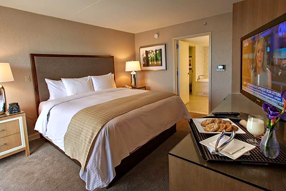 Relax in this stylish two-room suite, complete with a king-sized Sweet Dreams® by DoubleTree bed, separate living room and accessible bathroom with roll-in shower. Catch up on business at the desk and browse online using WiFi (fees apply), or unwind with a movie on your 42-inch TV. Our staff is ready to provide you with any assistance you may need. Do not hesitate to call on us. Any corresponding photo may not reflect the specific accessible room type or room feature.