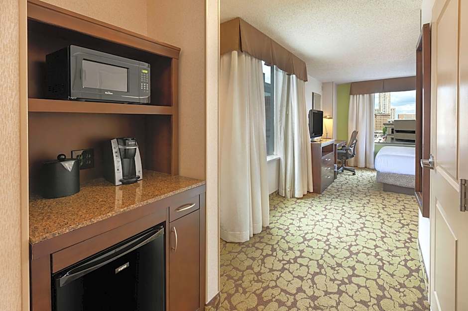 This mobility accessible deluxe one bedroom suite features one king-sized bed, and a roll-in-shower. Roll-in-shower with attached accessible seating, lowered vanity in bathroom, and lowered closet shelf. The ergonomic Mirra chair by Herman Miller is good for your back and better for work. Enjoy your favorite television show on our 36-inch HDTV. There is also a microwave, refrigerator and coffee and tea maker to help you feel at home. A separate living area with a full-sized sofa bed, coffee table and TV. For conducting business, our rooms ensure your productivity thanks to the spacious work desk, two telephones with dataport and voicemail and complimentary wired and wireless high-speed access. Any corresponding photo may not reflect the specific accessible room type or room feature.