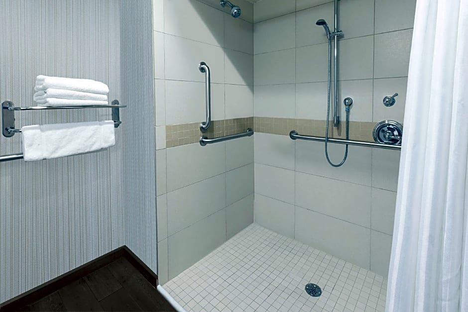 This mobility accessible standard room features one queen-sized beds, and a roll-in shower with attached accessible seating, lowered vanity in bathroom, and lowered shelf in closet. The ergonomic Mirra chair by Herman Miller is good for your back and better for work. Enjoy an in-room movie or your favorite television show on our 36-inch HDTV. There is also a microwave, refrigerator and coffee and tea maker to help you feel at home. And for conducting business, our rooms ensure your productivity thanks to the spacious work desk, two telephones with dataport and voicemail and complimentary wired and wireless high-speed access. Any corresponding photo may not reflect the specific accessible room type or room feature.