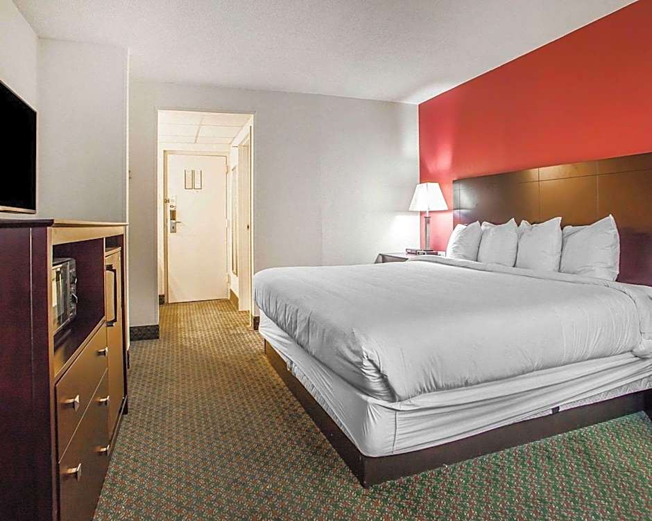 The Comfort Inn & Suites Wyomissing - Reading offers a variety of room types including queen suites with two queen beds, standard king rooms, king rooms with roll-in showers, king suites with tubs, queen rooms with tubs, and standard queen rooms with two queen beds. All rooms are non-smoking and have bed sizes ranging from queen to king. Room sizes are either 301 sqft or 355 sqft and can accommodate between 2 to 5 adults, with additional accommodation for children.
