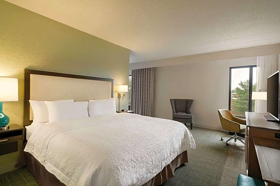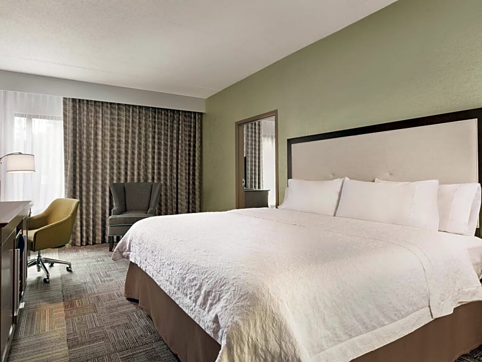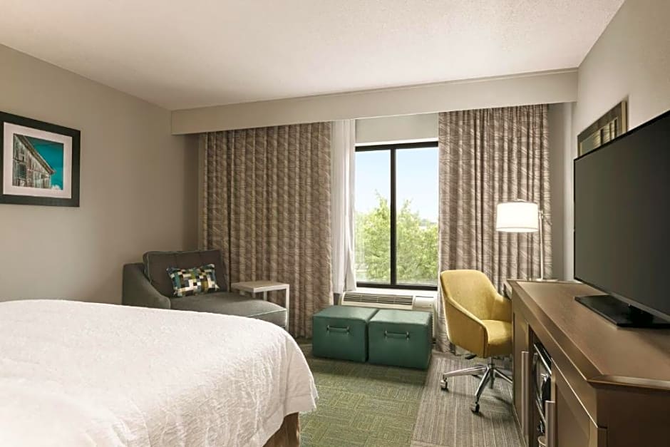 Work area, free WiFi, 32-inch HDTV, tea/coffeemaker, easy chair with ottoman Have a relaxing stay in this king room that features our clean and fresh Hampton bed®. Unwind in the easy chair with ottoman while watching the 32-inch HDTV. Enjoy a delicious hot drink from your in-room tea/coffeemaker. The room includes a spacious desk and free WiFi to let you catch up on work while traveling. In the bathroom, you'll enjoy fluffy towels, a WaterPik® showerhead and curved shower rod for added space and light.