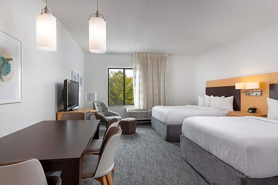 The hotel offers a King Studio with Sofa Bed and a Queen Room with Sofa Bed. Both rooms are non-smoking and can accommodate multiple adults and children. The King Studio has a king size bed and a sofa bed, while the Queen Room has a king size bed. Additionally, the hotel has a Two-Bedroom Suite with two queen size beds, as well as a Studio with two queen size beds.