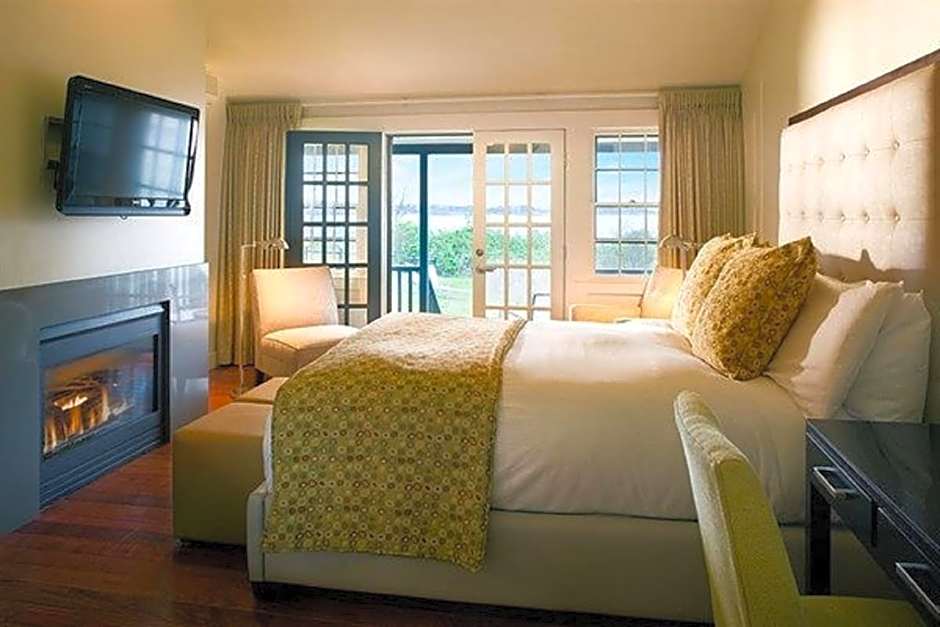 A fireplace, flat-screen cable TV and a semi-private patio with a bay view are included in this room.