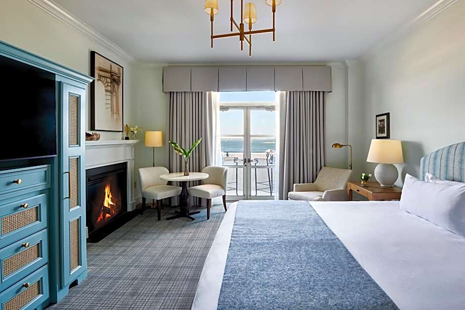 This top-floor room features a fireplace and a balcony with a Charleston Harbor view. A 49-inch flat-screen TV, small refrigerator, and free snacks are also included as well as a walk-in shower.