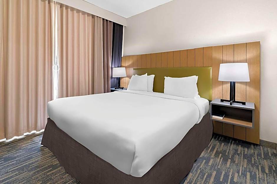 The hotel offers a variety of room types including One-Bedroom King Suites (non-smoking), Queen Rooms with Two Queen Beds (non-smoking), King Rooms (disability access/non-smoking), and One-Bedroom King Suites (disability access/non-smoking). The rooms vary in size from 312 sqft to 398 sqft, and can accommodate between 3 and 4 adults, along with 2 to 3 children. All rooms have a non-smoking policy and are equipped with either a King size bed or two Queen size beds.
