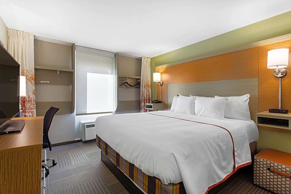 The design of the rooms and the price of the stay were outstanding. Why the city isn't redeveloping the area surrounding the hotel is a mystery to me; it's on active railroad tracks, near power and fire station facilities, industrial park buildings and some abandoned warehouses. The bedding was deluxe and I was extremely comfortable. The Wi-Fi was outstanding with more free premium channels than I knew existed and no shopping ones. I wish they'd put a password on their Wi-Fi as I'm uncomfortable using unsecured Wi-Fi, but there were so many pluses I didn't expect at that price: free coffee 24/7 in the lobby, and microwave, refrigerator, ironing board and iron, hair dryer, and continental breakfast during the week with a hot buffet breakfast on the weekends. Ice machine on the second floor of a three-story building (I'm much prefer to stay in low rise buildings than high-rises just in case of fire).