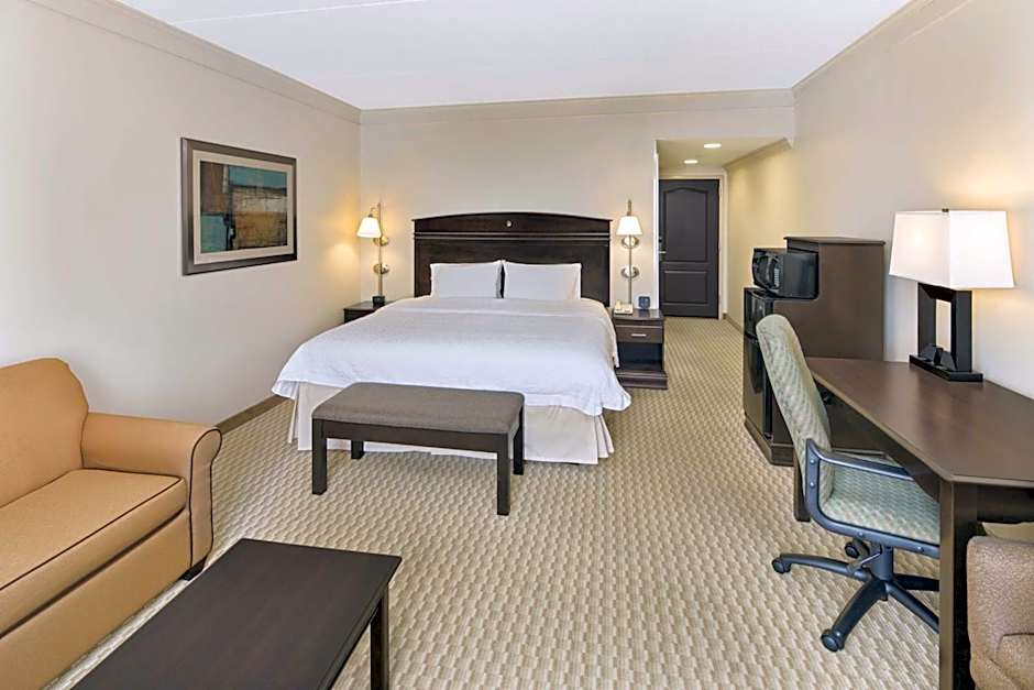 The types of rooms available at Hampton Inn Columbia I-20-Clemson Road include King Room - Non-Smoking with a king size bed and a sofa bed, Non-Smoking Double Queen Room with two queen size beds, and King Room Mobility/Hearing Accessible with Tub-Non Smoking featuring a king size bed. Smoking is not allowed in any of these rooms. The rooms can accommodate either 4 adults and 3 children or 3 adults and 2 children.