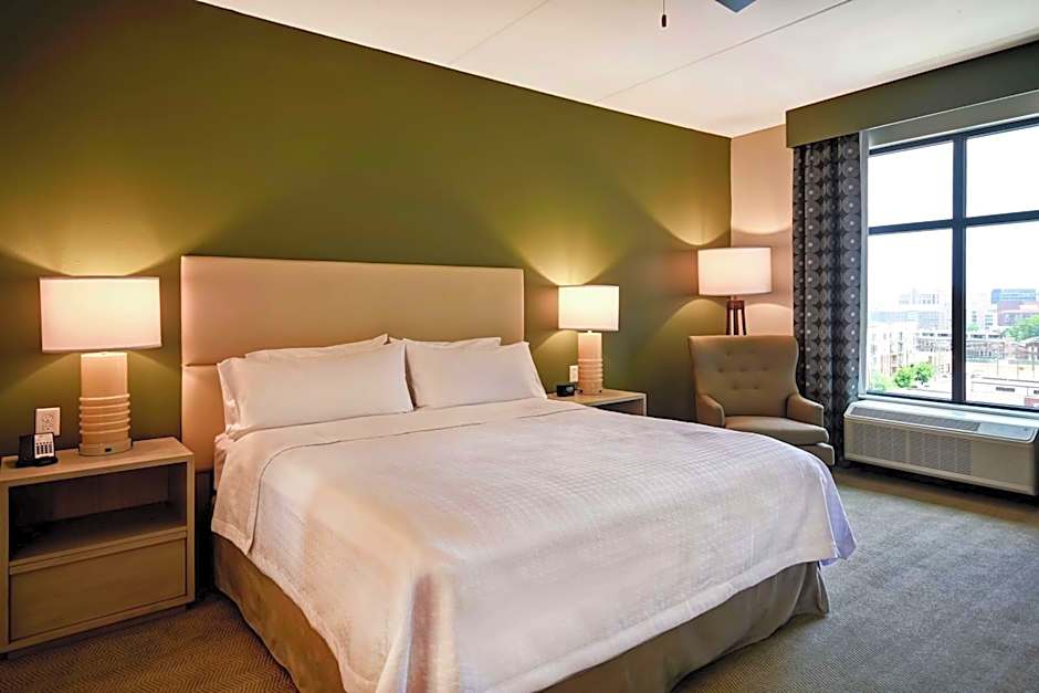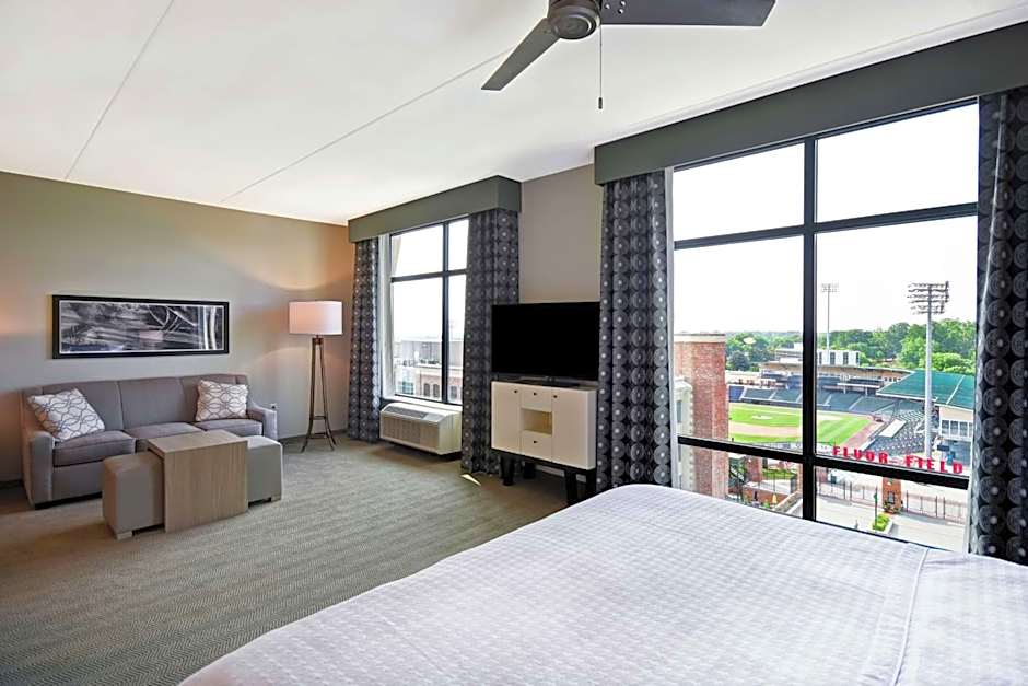 Homewood Suites By Hilton Greenville Downtown offers a variety of room types including One-Bedroom Suites with views, One-Bedroom King Suites, King Accessible Roll in Shower Suites, and King Studio Suites. All rooms are non-smoking, have a room size of 301 sqft, and can accommodate up to 4 adults and 3 children. The majority of the rooms feature a King size bed, with some also including a sofa bed.
