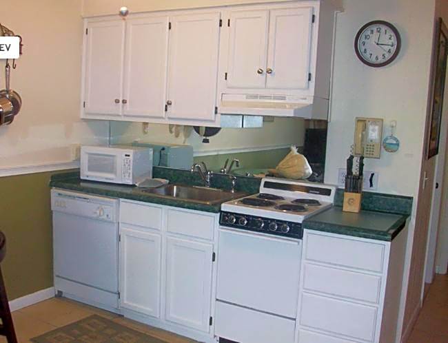 This oceanfront villa features a fully equipped kitchen and a living area with a sofa bed.