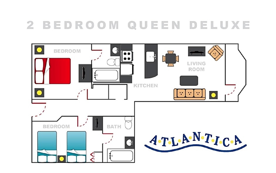 Atlantica Resort offers various suite options including One-Bedroom Suites, Two-Bedroom Suites, and Deluxe Two-Bedroom Suites. These suites range in size from 581 sqft to 732 sqft. There is no smoking allowed in any of the rooms. The accommodations in these suites can vary, with some rooms able to accommodate up to 5 adults and 3 children. Bed sizes include Queen size beds, King size beds, Twin beds, and Sofa beds.
