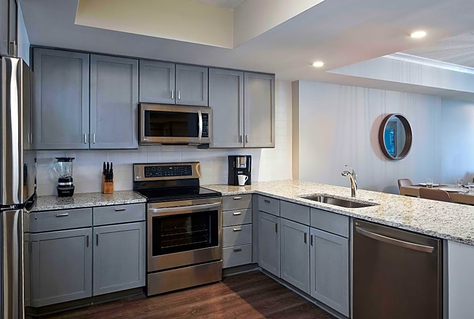 1KING BDRM OCEANVIEW HEARING ACCESSIBLE SUITE, 15USD RSRT CHG -VIS DOORBELL/PHONE -SOFABED, LVG/DNG -KTCHN -BLCNY -2TVS -WSHR/DRYR -SLPS4