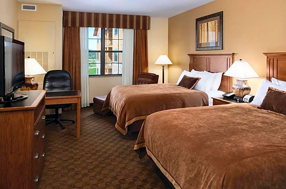 The Lodge at Deadwood offers a variety of room types including Deluxe Queen Rooms with Two Queen Beds, Quadruple Rooms, and King Rooms. All rooms have a size of 388 sqft and do not permit smoking. The Deluxe Queen Rooms and Quadruple Rooms can accommodate larger groups with 6 adults and 2 children or 4 adults and 3 children respectively, while the King Rooms are suitable for 2 adults and 1 child.