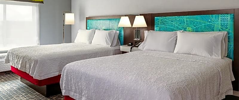 At Hampton Inn Lead, the types of rooms available include Queen Rooms with Two Queen Beds with Bath Tub and City View - Mobility Accessible, King Rooms with City View - Non-Smoking, King Suites with City View - Non-Smoking, and Queen Rooms with Two Queen Beds. The occupancy of all rooms is either for 2 adults and 1 child or 4 adults and 3 children. Smoking is not allowed in any of the rooms. The bed sizes vary between King and Queen size beds.