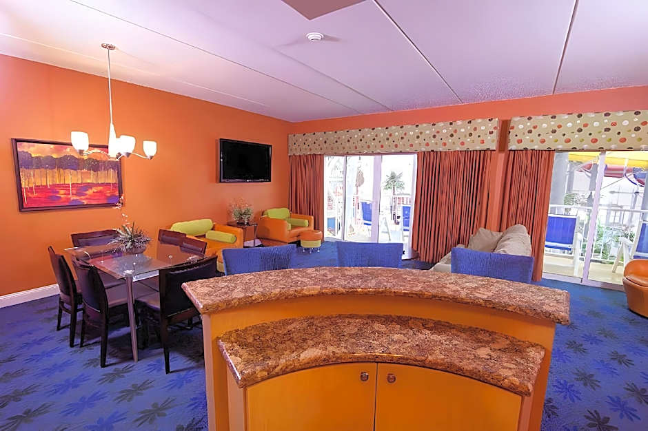 The room I reserved was unavailable, so we were 'upgraded' to a suite of the same type but in a different location, which was small and featured a balcony facing the water park. We were not informed at the time of booking a second night—at an increased rate—that the water park would undergo cleaning at 1 AM for several hours. The loud noise from the pressure washer and vacuum woke us up. While the sounds from the water park were inaudible with our door closed, the cleaning noise was extremely loud, to the extent that even the staff member was wearing ear protection.
