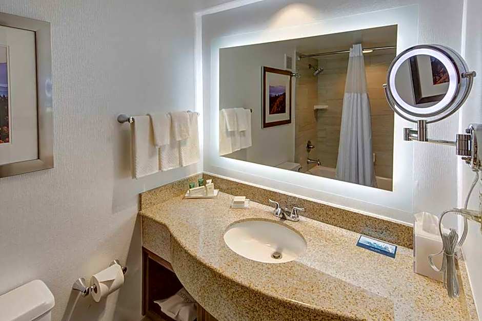 This mobility and hearing accessible standard room features one king-sized bed, and a roll-in shower. The room also has a visual alarm, and notification devices for the doorbell or door knock and incoming telephone calls. Any corresponding photo may not reflect the specific accessible room type or room feature.