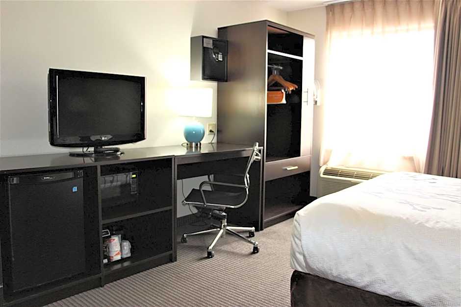 This guestroom features include a microwave, refrigerator, hair dryer, iron and ironing board, coffee maker, fiber optic WiFi, premium HDTV channels and guestroom safe.